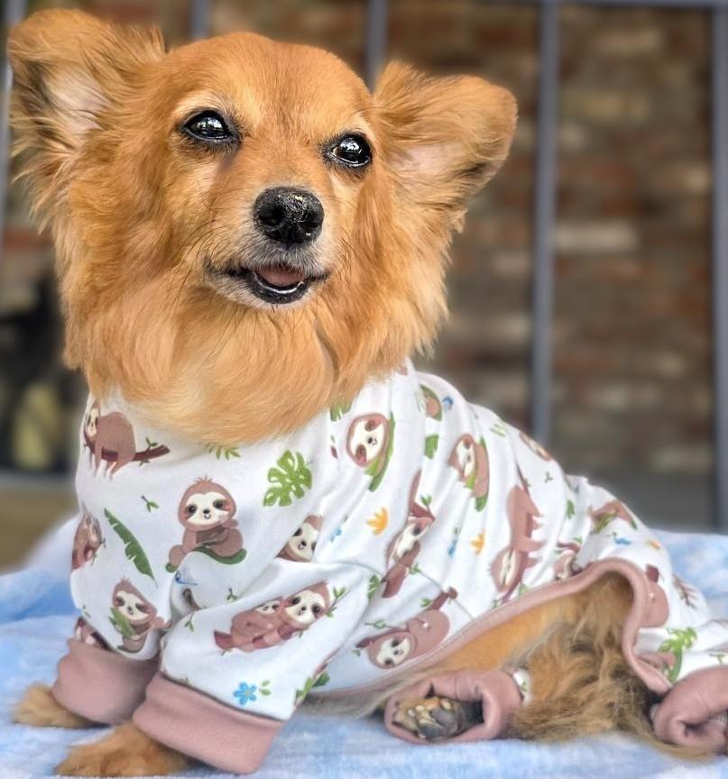 Take it slow and let your dog relax in ultimate comfort with our soft dog pajamas featuring adorable sloth prints. Super soft fabric with brown cuffs, this full-body onesie features a lazy day sloth print and comes in sizes XS to XXL.  Thoughtfully designed with a convenient leash hole, it's perfect for lounging or keeping your pup warm during chilly nights.